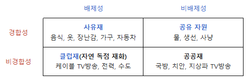 | 비경합성 | 클럽재 (자연 독점 재화) 케이블 TV 방송, 전력, 수도 |